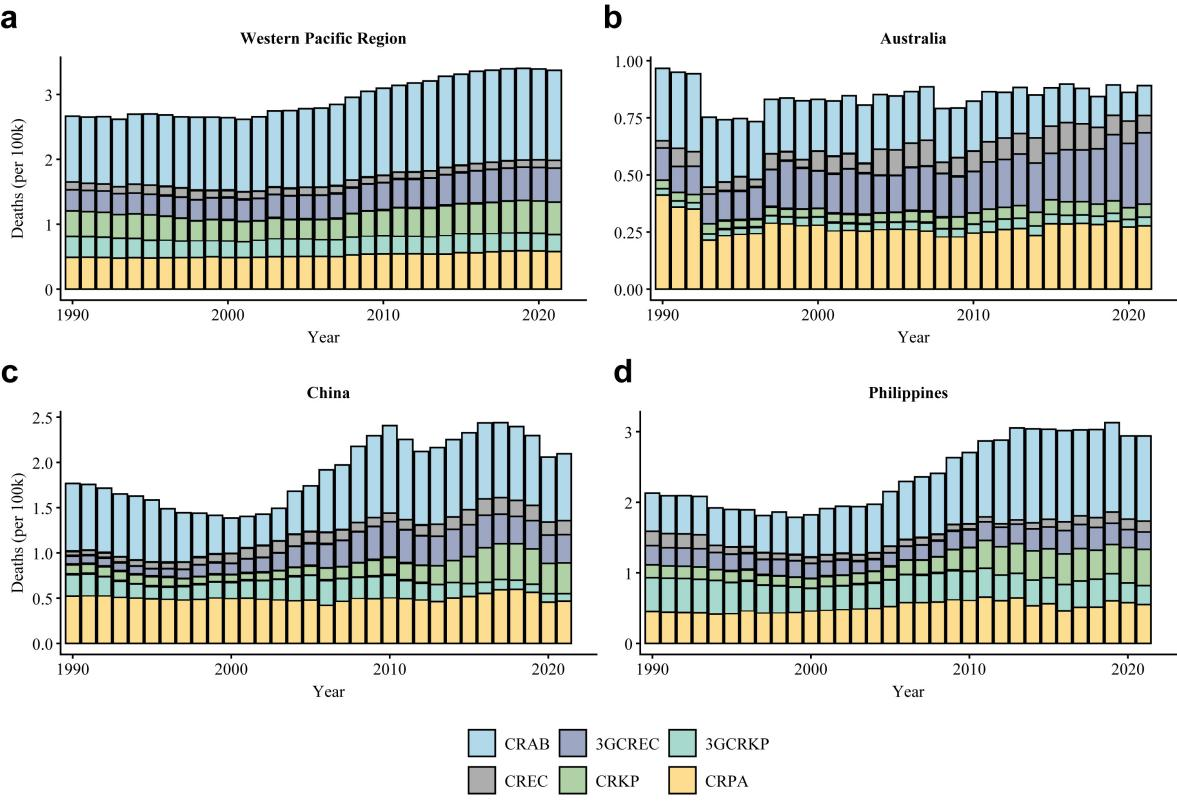 研究发现,1990—2021年间西太平洋地区AMR归因死亡率整体呈持续上升趋势,其中碳青霉烯耐药鲍曼不动杆菌(Carbapenem-Resistant Acinetobacter baumannii,CRAB)的增长尤为显著。不同国家间AMR死亡负担差异明显,中低收入国家AMR归因死亡率上升幅度更大,提示区域内AMR负担分布存在显著不均衡,这一现象可能与社会经济发展水平和卫生系统能力密切相关。
